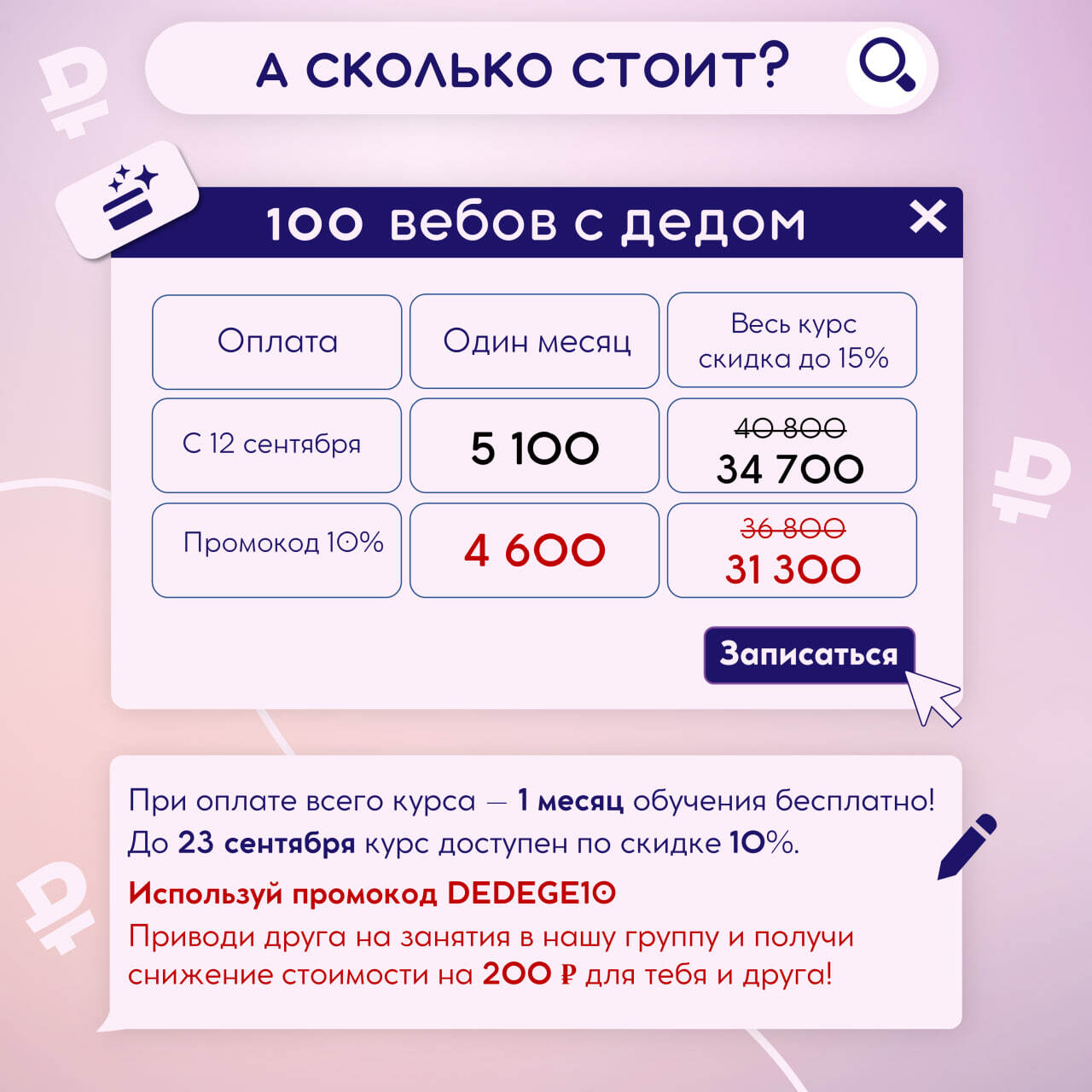 Вы можете снизить стоимость своего обучения, пригласив друга. От каждого пришедшего ученика ты получишь -200р. от стоимости обучения. Если ты приобретал курс за 4 600р., и пригласил 4-х друзей, одноклассников учиться вместе с нами, то стоимость для тебя составит - 3 800р., а для каждого ученика - 4 200р.